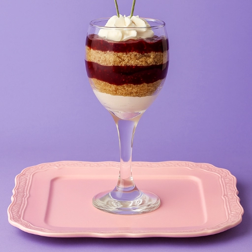 Sobremesa sofisticada em camadas de chocolate, bolo de lavanda, chantilly e geleia de frutas vermelhas.