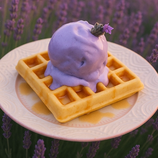 Waffle crocante servido com sorvete de lavanda e fio de mel, unindo texturas e sabores suaves e doces.